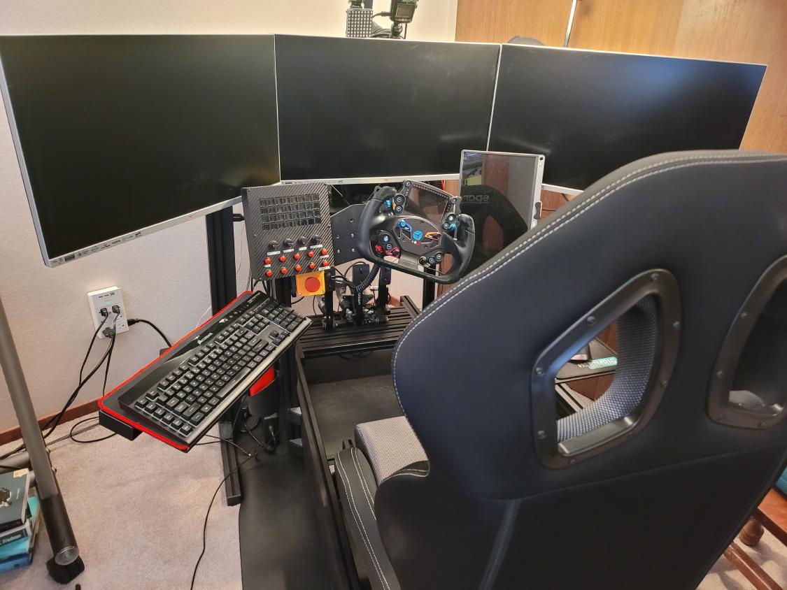 PCA uses Discord to communicate between cars. Equipment recommendations can be found on the Racing Equipment page on the PCA Sim Racing website, but keep in mind that a lower spec computer may still do the job. A big takeaway from the talk was that you don’t need to spend a lot of money on equipment. High-end set-ups don’t necessarily make you a faster or better driver, but they do offer a more immersive experiencem which some people like, and some people don’t. Used equipment can be found for sale on the Discord channel. A minimal set-up is a computer, Logitech G29 wheel and pedals, a monitor, and some manner of stand to mount the wheel and pedals to. Chuck had pictures of some pretty basic (and very creative!) DIY setups, plus some moderate and high-end rigs.