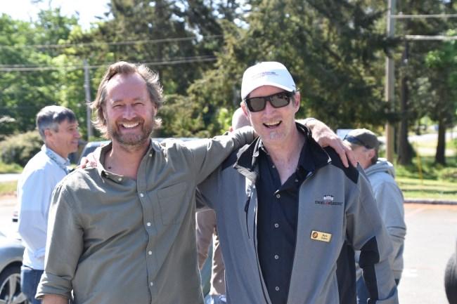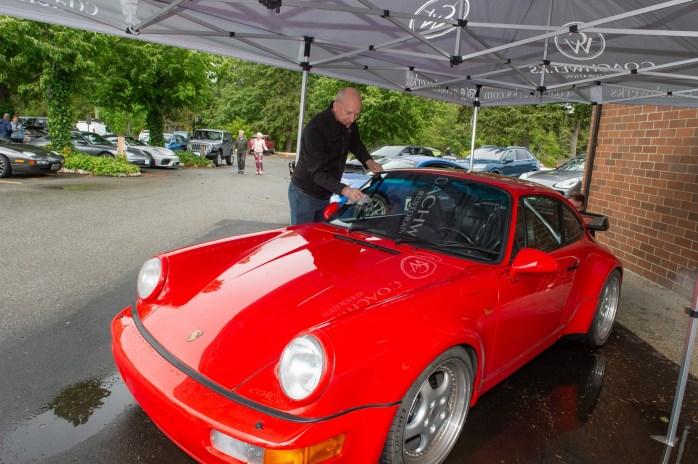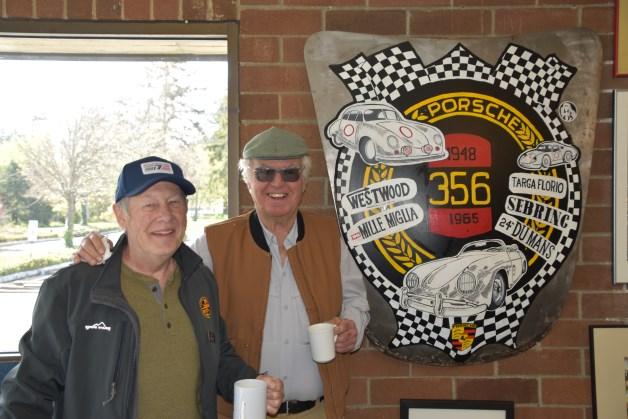 On Sunday morning, there was a Cars and Coffee organized by Franz-Albert Burgund. For a full look at the field, check out Franz-Albert’s video on the VIR Facebook Group page. The coffee and baked goods provided were a welcome start to the morning –though the first welcome start for many of us was actually when the engine turned over (LOL). Attendees voted on the car they liked best, and the People’s Choice award went to Brad Johnston with his 1962 Oslo Blue 356, which he restored himself. Not just a pretty face, the 356 also competed in the TSD rally the day before, coming in third in the Seat of Pants class. Marc Klijnsmit of Café 356 was presented with a beautiful cedar carving of the VIRPCA logo, created by VIR member Didier Brard, which had raised $1,000 during Saturday’s live auction.