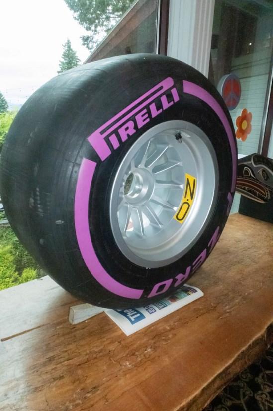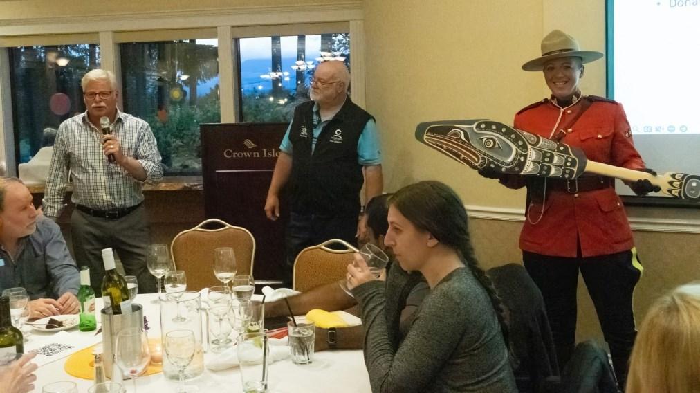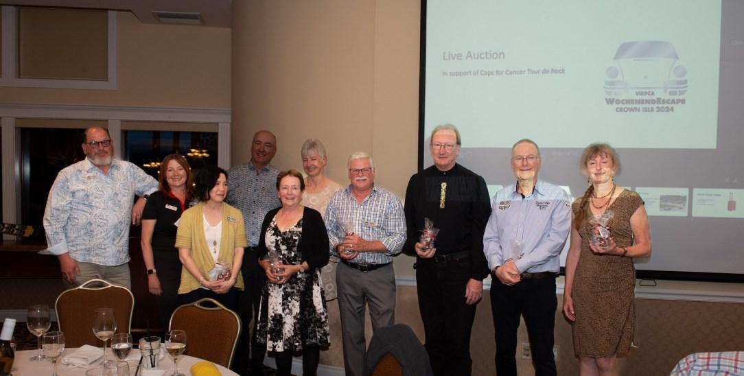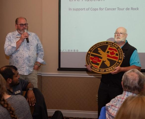 The bidding started gently, with the RCMP bear going for $250. Things started to warm up from there with more spirited bidding on the golf packages and the Vancouver Island Motorsport Circuit track day package, as well as the car protection items from Xpel and Wrapture. The Porsche Design luggage was highly coveted and elicited some determined bidding. A Pirelli Formula One tire was a rare opportunity for the F1 enthusiasts in the crowd, fetching a podium position. Garage Kings’ offering of a garage floor coating was a popular and hard-won item, and the most sensational purchase of the night was the sale of the Bill Henderson loon paddle for $5,000! The total take for the evening was more than $16,500. Constable Deley was overwhelmed with the generosity of VIR and PCA members in bringing in over three times her fundraising goal.