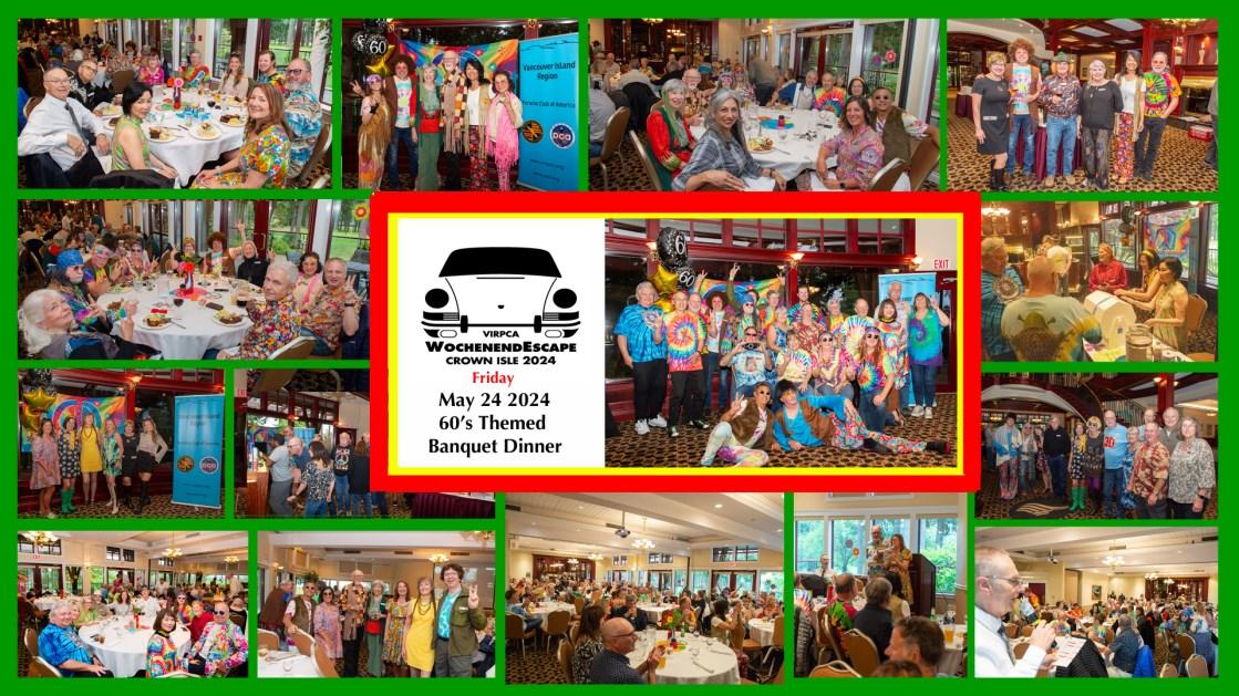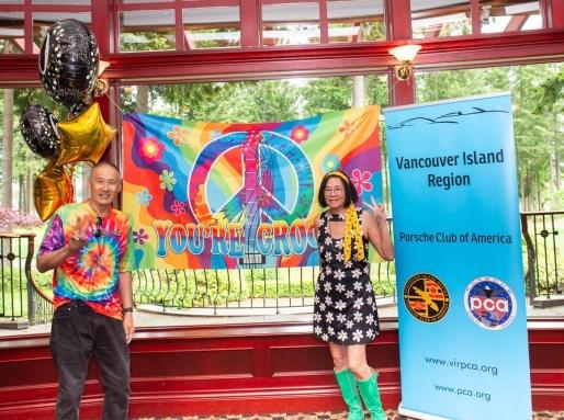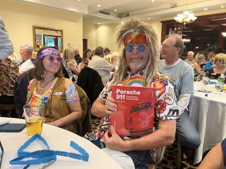 After lunch, partygoers were on their own until it was time to get ready for the 60’s themed dinner, for which nearly everyone turned up in a blast from the past. Fringe-vests and tie-dye and afros, oh my! Crown Isle served up 60’s comfort food in the form of brisket, baby back ribs, macaroni and cheese, salads, and a “Death by Chocolate” cake. Music was provided by VIR member Bernie Haley, who reintroduced us to some of the music of the times. WochenendEscape Co-Chair Trevor Ross and Bernie took turns selecting draw prize winners, and the lucky winners received Porsche-branded merchandise.