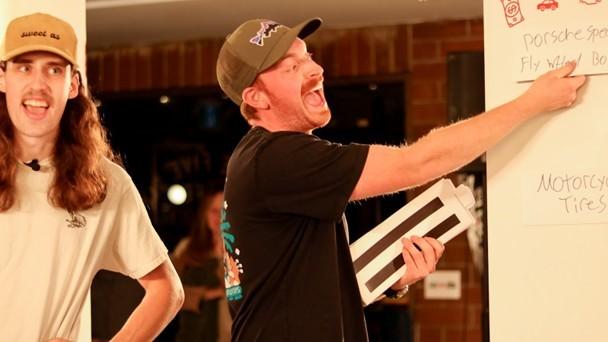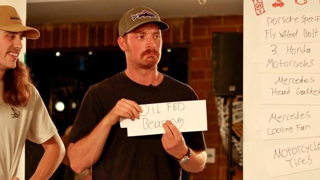 Matthew gets the crowd involved as they try to guess how expensive a fly wheel bolt for his Porsche might be.