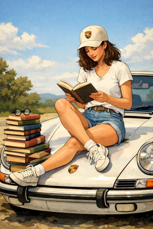 While no one is suggesting anyone actually sits on the hoods of our Porsches to read the books picked in the book club, we are as engrossed in our reading of the book club choices as the picture on the right suggests, and the cars are ever present. Here is the first Book Club report from Kim Cole: