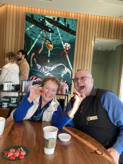 Sheila Jager offering a heart shaped chocolate to Franz-Albert, at Cars & Coffee.