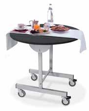 45 Models Modelle Top shelf dim. Abmessung des obersten Regals Cm Max dim. Max. Abm. Cm 1104-80N ø 80 ø 80x78 h 1104-90N ø 90 ø 90x78 h 1104-100N ø 100 ø 100x78 h • Stainless steel construction, brushed finish • Round water-repellent black MDF top protected by transparent coating, folding side leaves • The top folds vertically to nest the tables together and save space • Swivel castors, ø 9.5 cm, 2 with brake Room service tables Art.1104-80N Foldable - Nestable
