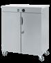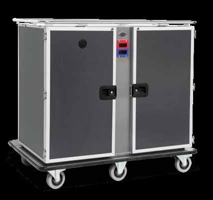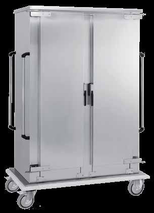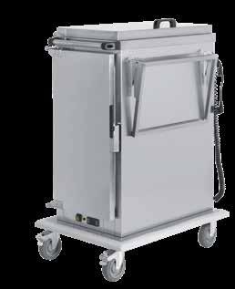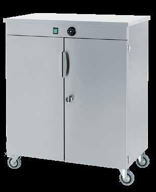 DISPLAY CASES • Fully stainless steel sheet construction, insulated with injected high density expanded polyurethane • 180° opening tempered glass doors on 2 sides with no sharp edges and removable PVC door seals for easy cleaning • Snap-closing hinges • Stainless steel tube side pushing handles with PVC brackets • Ventilated heating, power 2000W • Control panel with digital thermostat-thermometer and ON/OFF switch with warning light • Mains supply: 230V, 50Hz (60 Hz upon request), single-phase • 3-mt long coiled power cable • Swivel castors ø 12.5 cm, 2 with brake