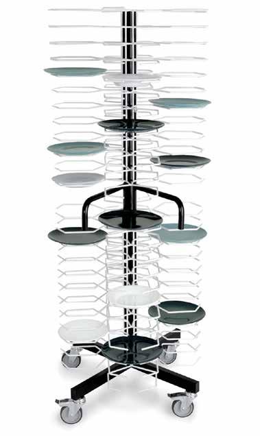 15 Wheeled plate stackers • Black epoxy powder painted steel construction • White rilsan plastic coated steel plate support • Pushing handles • Swivel castors, ø 12.5 cm, 2 with brake Models Modelle Plate capacity Plattenkappe Plate Ø Teller-Ø Cm Max dim. Max. Abm. Cm 3020 48 18÷24 77x77x95 h 3019 24 24÷31 3008 48 18÷24 77x77x180 h 3009 72 IFA0011 96 3013 48 24÷313012 72 IFA0012 96 6 6 6 6 6 6 Art. 3011