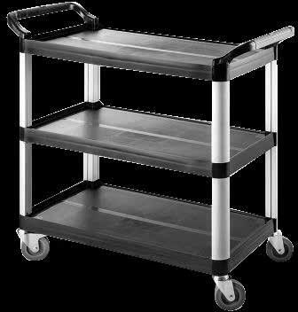9 Models Modelle Shelves Regale Description Beschreibung Shelf dim. Regalabm. Cm Max dim. Max. Abm. Cm 1552 1 Holding structure without bottom for 3x1/1 GN pans (not included) 105x51 112x62x112 h 1515S 1 105x51 117x63x94 h IFI0012/E 2 87x44 98x51x91 h 1527 3 98x51x110 h • AISI 304 stainless steel 2.5x2.5 cm square tube frame, brushed finish • Upper shelf for up to 3x20 cm-deep GN 1/1 pans (not included) • Lower removable stainless steel shelves • Grey rubber ring buffers • Swivel castors, ø 12.5 cm Stainless steel clearing trolleys Art. 1550F + pans Art. 1515V-F Art. IFI0012/E