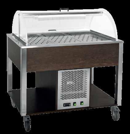 10 Refrigerated trolley • Plexiglass semi-cylindrical dome opening on both sides • Plywood panels and shelf • AISI 304 stainless steel legs, brushed finish • For BLACK finish: structure in water-repellent MDF with transparent coating • AISI 304 stainless steel 19 cm-deep well for up to 15 cm-deep GN pans (not included) • Condensation drain hole at the base of the well (drain tap available on request) Note: the drain tap is necessary for fish displaying • Control panel with digital thermostat-thermometer and ON/ OFF switch with warning light • Mains supply: 230V, 50 Hz (60 Hz upon request), single-phase • Static refrigeration +4°C +10°C • Swivel castors ø 12.5 cm, 2 with brake Oak Model Version Ausführung GN Power Anschlusswert kw Max dim. Max. Abm. Cm 6930.2R Oak 2x1/1 190W 80x68x120 h6930.2W Wengé 6930.2N Black 6930.3R Oak 3x1/1 350W 113x68x120 h6930.3W Wengé 6930.3N Black 6930.4R Oak 4x1/1 450W 161x68x120 h6930.4W Wengé 6930.4N Black Art. 6930.3W + A20(x3)