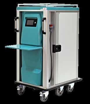 The trolleys are filled with the trays which are prepared at the portioning kitchen and they are transported to the patient floors. The vehicle consists of two compartments. There is an isolation wall separating these two chambers. The cold compartment of the trolley is at + 4°C (adjustable 0°C / + 6°C), the hot compartment is at 100 ° C (adjustable 50°C / 100°C.). As long as the meals are served, the internal temperatures are kept at the right values and these values do not change until the food served to patient bed.