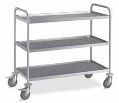 11 Service trolleys with pressed shelves • AISI 201 stainless steel trolleys • Round tube frame ø 2.5 cm • Tray shaped stainless steel pressed shelves bolted to the frame, sound-proof and with no sharp edges, brushed finish • Grey rubber buffers • Swivel castors ø 10 cm, 2 with brake • MADE IN PRC • AISI 304 stainless steel trolleys, brushed finish • Round tube closed frame ø 2.5 cm • Tray shaped stainless steel pressed shelves welded to the frame, sound-proof and with no sharp edges • Grey rubber ring buffers • Swivel castors ø 12.5 cm, 2 with brake Art. 5041 Art. 5014 Models Modelle Shelves Regale Shelf dim. Regalabm. Cm Max dim. Max. Abm. Cm 1516 2 47x44 58x51x91 5041 2 75x44 81x50x86 5014 3 75x44 81x50x86 1400CP 2 80x50 89x59x95 h IFA0001 2 100x60 109x69x95 h IFA0002 3 1403P2 2 120x60 129x69x95 h Art. IFA0001