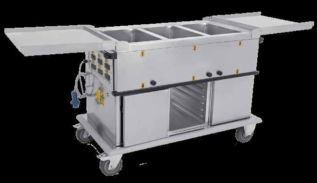 22 • AISI 304 stainless steel sheet construction, brushed finish • Polyurethane foam insulation panels • Heat-proof pushing handles • Separate Bain-Marie wells in pressed steel sheet with no sharp edges for up to 20 cm deep GN pans (not included) • Separate Bain-Marie drain taps • Separate heated or neutral lower compartments with no-sharp edges (compliant with H1 hygiene system), with independent thermostats, insulated 270° opening side doors, with magnet (to keep the doors open). N. 6 pairs of “pressed” runners suitable for containers 1/1 GN (or submultiples) spaced 5.5 cm • Mains supply: 230V, 50/60 Hz, single-phase • Bain-marie heating with heating element outside the well • Dry heating: details and quotes upon request • IPX5 digital control panel supplied as standard with independent thermostatic control - one thermostat for each heated well/compartment. • 3-mt long coiled power cable, SCHUKO plug • All round grey non marking rubber bumpers • 2 Fixed and 2 braked swivel castors with heavyduty brackets, ø 16 cm; grey non marking rubber tread on centre with roller bearing hub Bain-marie cupboard Separate wells +30° Note: IPX5 digital control panel is supplied as standard in the Bain-Marie trolleys with pressed runners (“GS” range) Art. 7375A3-GS-E-C3 Models Modelle GN Lower compartments Untere Fächer Power Anschlusswert W Max dim. Max. Abm. Cm 7370A0-GS 2x1/1 1200 95x72x96 h7370A1-GS 1600 7370A2-GS 2000 7375A0-GS 3x1/1 1800 134x72x96 h 7375A1-GS 2200 7375A2-GS 2600 7375A3-GS 3000 7370A 2x1/1 1200 95x72x96 h 7375A 3x1/1 1800 134x72x96 h 7378A 4x1/1 2400 172x72x96 h Neutral hot