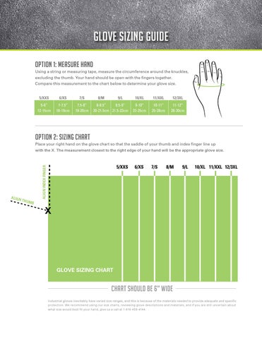 chart should be 6” wide Industrial gloves inevitably have varied size ranges, and this is because of the materials needed to provide adequate and specific protection. We recommend using our size charts, reviewing glove descriptions and materials, and if you are still uncertain about what size would best fit your hand, give us a call at 1-616-459-4144.