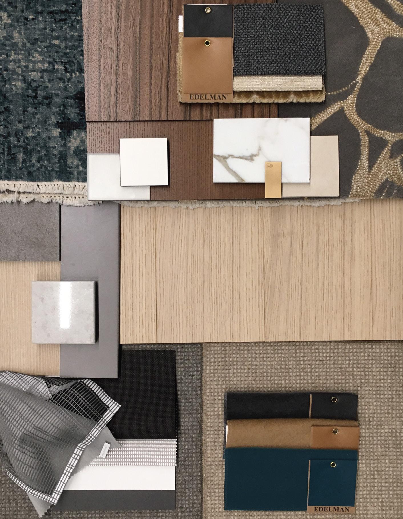 The warm color palette imparts a soft, sophisticated, and inviting atmosphere to the suite. A thoughtful mix of smooth, reflective, and textured finishes enhances the space, seamlessly tying the materials back to the core design concept.