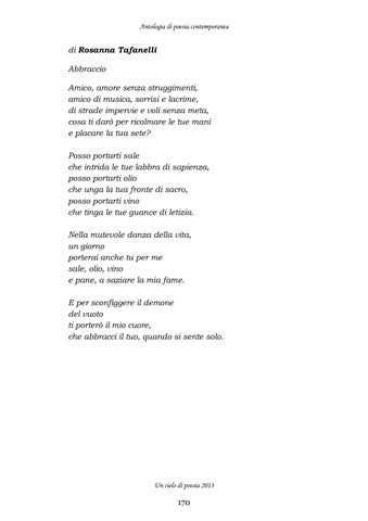 di Rosanna Tafanelli Abbraccio Amico, amore senza struggimenti, amico di musica, sorrisi e lacrime, di strade impervie e voli senza meta, cosa ti darò per ricolmare le tue mani e placare la tua sete? Posso portarti sale che intrida le tue labbra di sapienza, posso portarti olio che unga la tua fronte di sacro, posso portarti vino che tinga le tue guance di letizia. Nella mutevole danza della vita, un giorno porterai anche tu per me sale, olio, vino e pane, a saziare la mia fame. E per sconfiggere il demone del vuoto ti porterò il mio cuore, che abbracci il tuo, quando si sente solo.