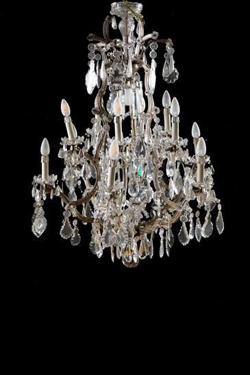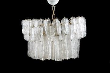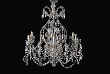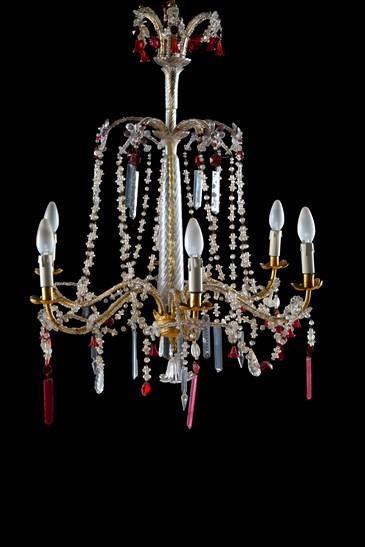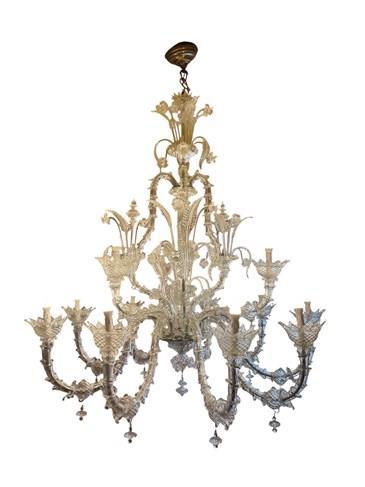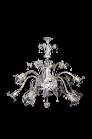 Lampadario otto luci in vetro di Murano, metallo verniciato bianco e ferro.