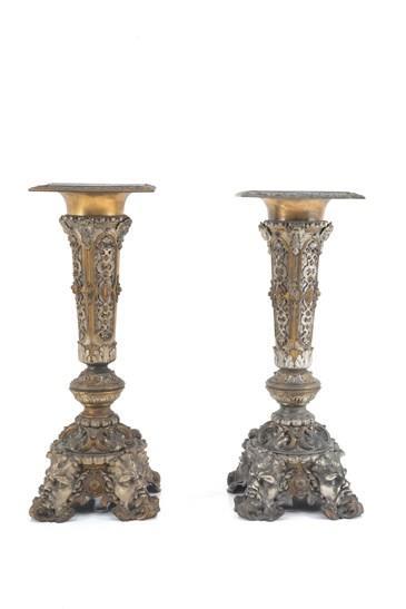 Coppia di vasi in bronzo patinato con decori e applicazioni floreali dorati e ramati. Giappone. Fine XIX secolo.