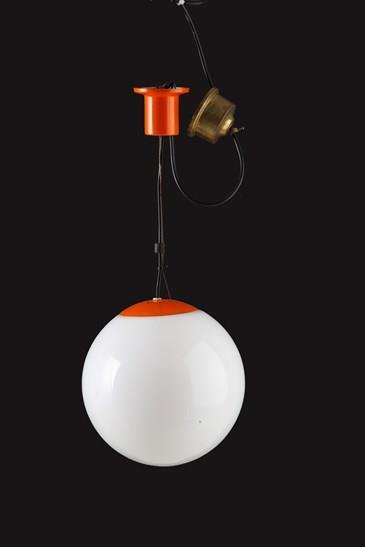 Lampadario a sospensione in vetro bianco e metallo verniciato arancione. Anni '70. Estensione massima 100 cm ca.