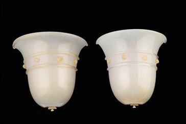 Due ciotole biansate in vetro soffiato di Murano color giallo paglierino. Firma ad acido M.V.M. CAPPELLIN, Murano. Difetto di cottura. Pubblicate in Marino Barovier e Carlo Sonego (a cura di), Vetreri