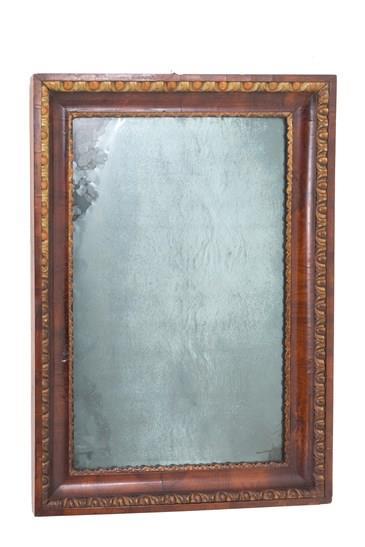 Tavolo da riunione impiallacciato in piuma di mogano con fascia intervallata a semitamburo, su gambe a due fasce unite da longoni, con dodici poltrone in noce d'India e pelle marrone. XX secolo. Difet