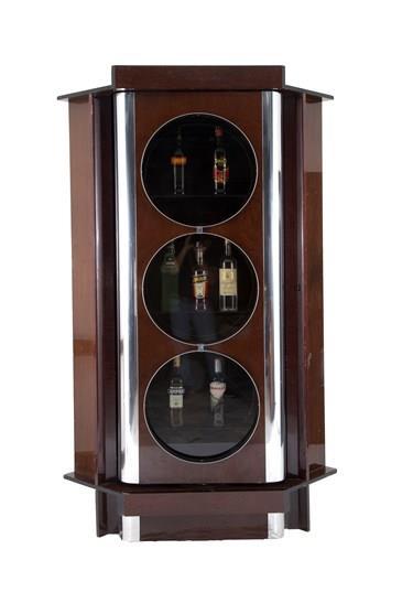 Mobile bar girevole angolare autoportante in mogano e acciaio cromato con tre ripiani in vetro. Anni '70-'80. Segni di usura del tempo.