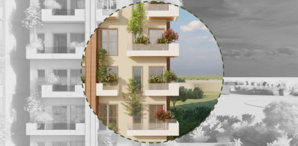 Sharing of trees Incorpororated in the Design Such that the consecutive Double Heighted Balconies Will share the foliage of the trees planted by one tenant with the one residing above