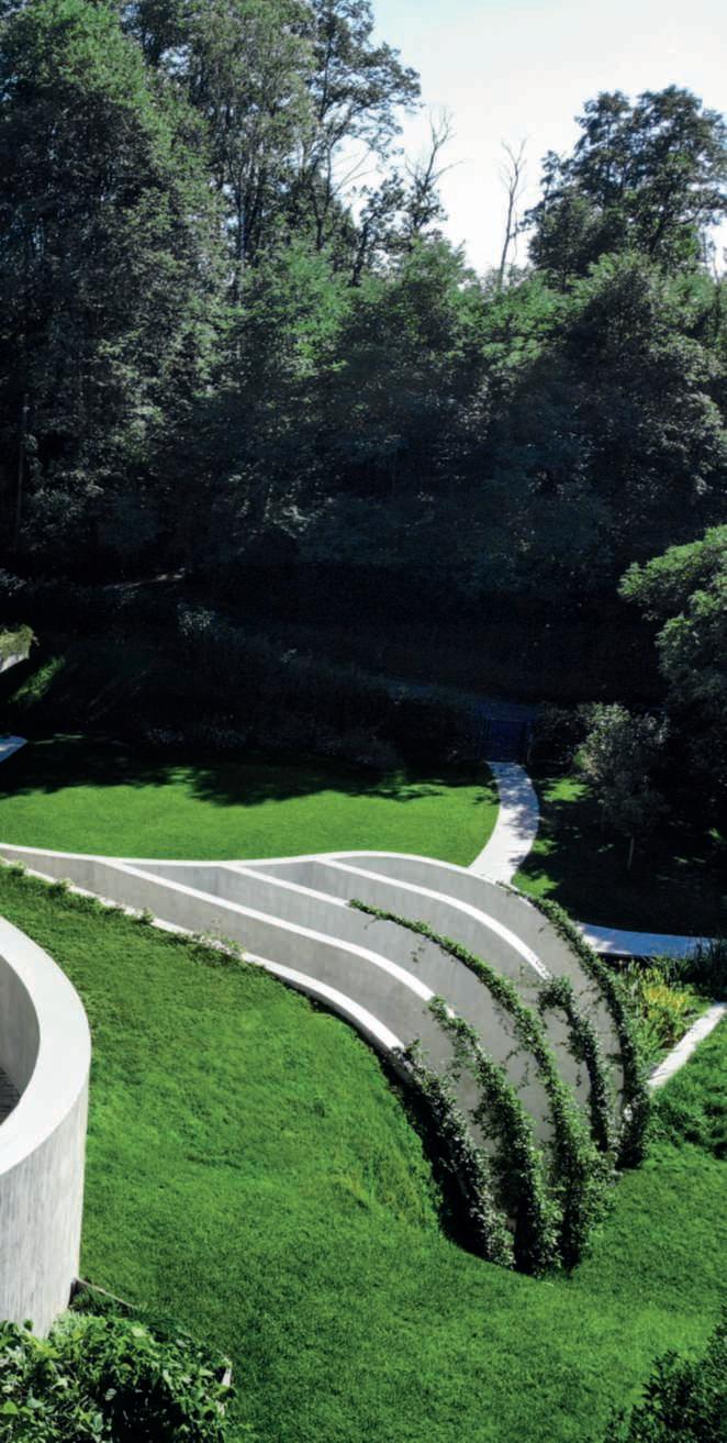 Leformesinuosealleggerisconolastrutturascultoreadefinita dal cemento armatoavistae la composizioneaterrazze dei pianipermettela realizzazionedicopertureverdi incui la vegetazione ricoprebuona