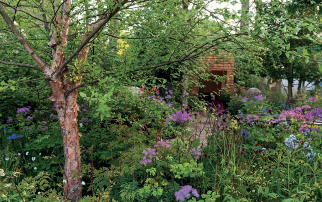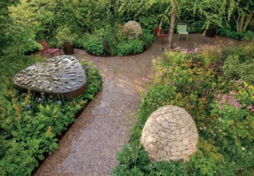Nellepagineprecedenti, una vistadi Horatio’s Garden sulla MainAvenue al Chelsea Flower Show. Si notano la fontana coi calchi delle posate e il padiglione per accogliere i letti durante il giorno.Inquesta pagina,inalto,un’altravistadel giardinodovesipuòapprezzarela studiatacombinazione dipiante e,inprimopiano, una Betulanigra;inbasso,una vistadei percorsi realizzaticon un materialeinnovativo.