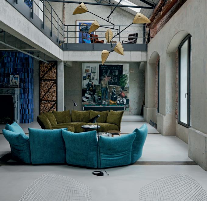 In the living area, each of the two Standard sofas by Edra is paired with an AJ floor lamp designed by Arne Jacobsen for Louis Poulsen