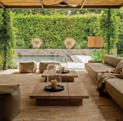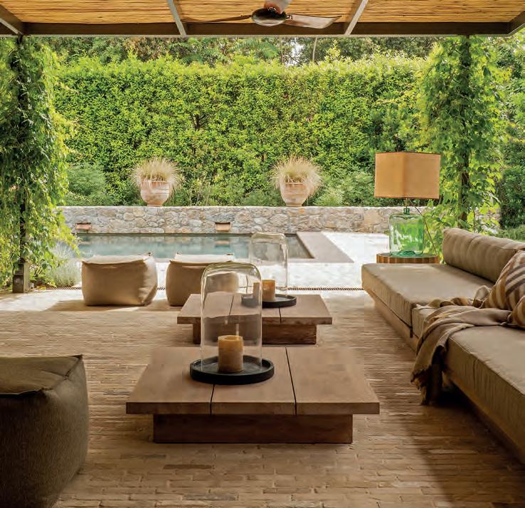 In questa pagine, il grande salone si affaccia sul giardino attraverso una vetrata angolare a tutta altezza, dissolvendo il confine tra interno ed esterno. Il portico in aggetto filtra la luce, proteggendo gli spazi dal sole diretto e mantenendo un’atmosfera fresca e luminosa. Gli arredi minimalisti rispecchiano i toni della natura: verde e marrone si riflettono nei materiali e nei tessuti, mentre il pavimento in marmo bianco amplifica la luce e restituisce l’essenza del paesaggio.