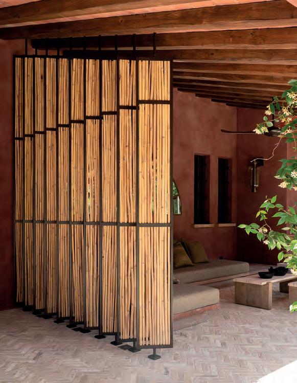 On these pages, other views of the veranda, furnished with custom-designed furnishings Here on the left, a vintage bamboo armchair, found in Parma and restored. At the bottom left, a swivel bamboo and iron screen designed by FNA. An elegant and versatile element, designed to stylishly divide the outdoor space. At the bottom left, Francesca Neri Antonello, who designed the residence with the FNA Concept studio