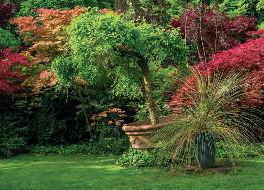 In queste pagine, quinte vegetali creano lo sfondo perfetto davanti al quale far risaltare specie rare, esemplari dalla forma architettonica o scultorea, anche tenute in grandi contenitori, quali Dasylirion quadrangulatum, Styphnolobium japonicum ‘Pendulum’ o un boschetto di Phyllostachys aureosulcata f aureocaulis, dai culmi dritti di un brillante giallo dorato, talvolta solcati da leggere striature verdi, per aggiungere luce e verticalità