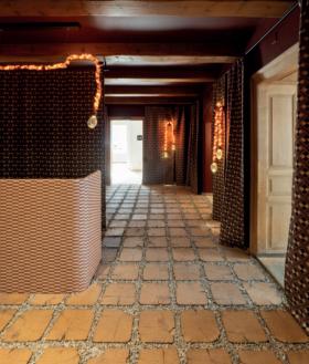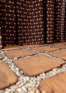 quadrotti di legno irregolari riprende il dialogo mai interrotto tra la progettazione di Francesca Neri Antonello e la naturalità, arricchendo lo spazio con un carattere autentico e vissuto, ulteriore omaggio alla memoria dei materiali. l