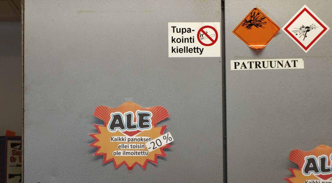 Kaupan intersportimainen ilme katkeaa vain tiskiin, jonka takaa aseet myydään. Seinällä on rivissä kivääreitä ja haulikoita. Tolpasta roikkuu kaksi militaria-aiheista seinäkalenteria.