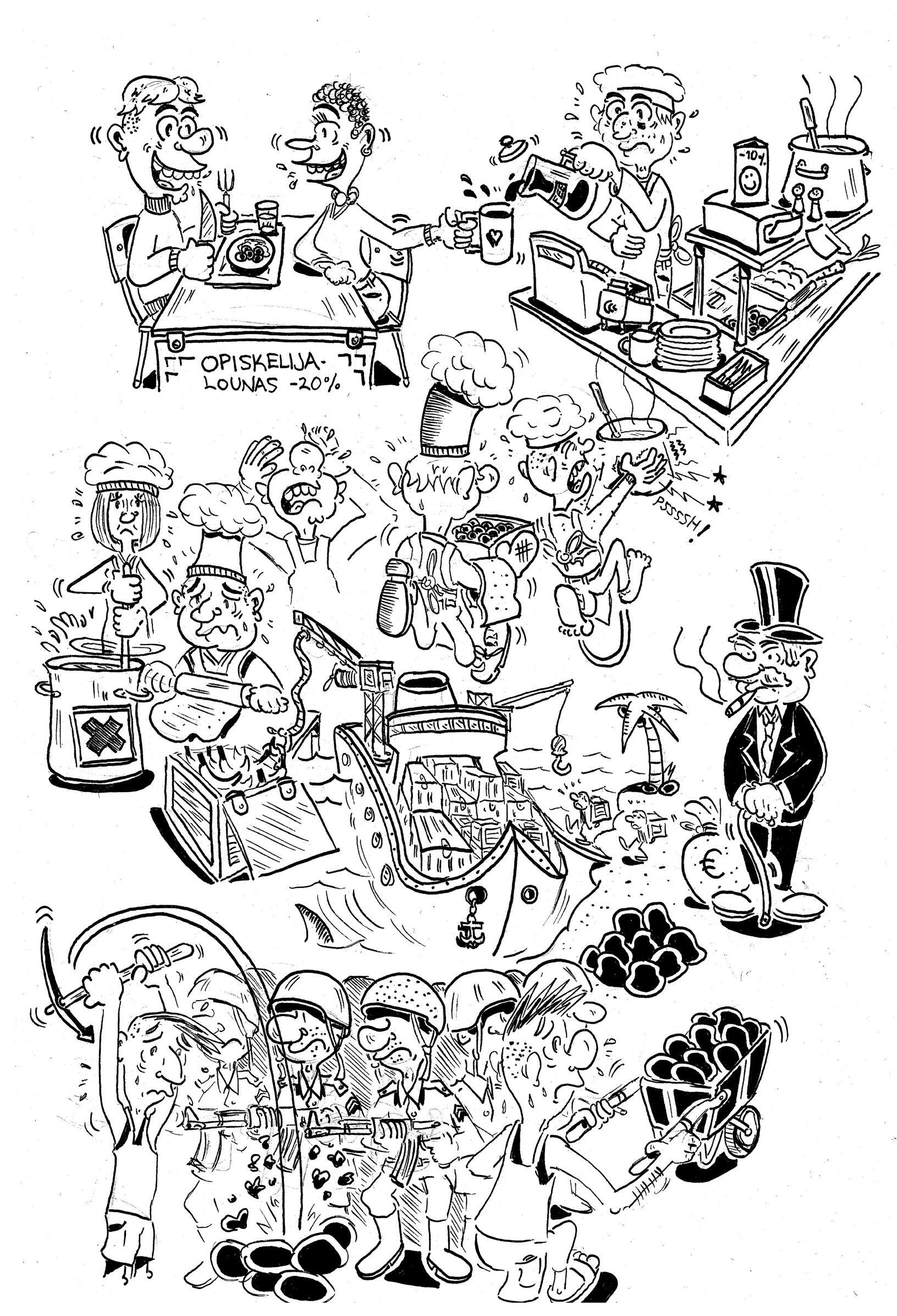 oska lehti ei synny tyhjiössä, Visiiriä saa ja pitääkin myös kritisoida. Jos haluaisit lukea Visiiristä jotakin erilaista, lähetä toimitukseen juttuvinkki – tai tee itse paremmin. Tässäkin lehdessä monien juttujen taustalla on lehtemme ansioitunut avustajakunta, joka on käynyt paikoissa ja perehtynyt ilmiöihin sivistyksemme tähden.Hanna Eskelinen ja Arttu Timonen kävivät tutustumassa Oasikseen (s. 8). Se on keskustakampuksen suosittu tila, jonka yliopisto kaavailee parhaillaan siirtävänsä syrjäisempään paikkaan ilman selityksiä. Silja Kinnunen pureutui fuksivuoden yksinäisyyden kokemuksiin kolmen opiskelijan tarinoiden kautta (s. 38). Artturi Kavaja sukelsi tuttujen kampusravintoloiden kaninkoloon ja tutki suuryritysten taustalta löytyviä kohuja (s. 46).