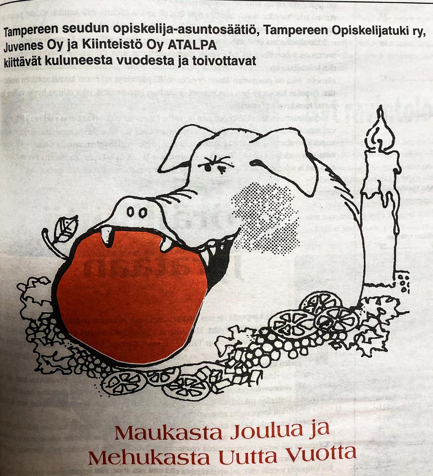 Tämän kirotun näköisen possun myötä kuluneesta vuodesta kiittää ja mehukasta joulua toivottaa myös Visiirin toimitus. (Aviisi 29.11.1995)