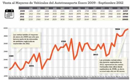 Al mayoreo las ventas de vehículos del autotransporte crecieron un 48.6%, al pasar de 2 mil 643 unidades comercializadas en septiembre de 2011, a un total de 3 mil 928 unidades colocadas en septiembre de 2012.