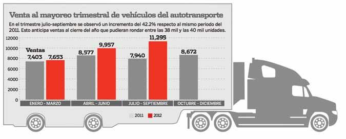 Así, las ventas de septiembre fueron las más altas en 48 meses, es decir desde septiembre de 2008, mes durante el cual se comercializaron un total de 4 mil 85 unidades. De forma acumulada, de enero a septiembre de este 2012 se han vendido un total de 28 mil 905 unidades de autotransporte, un 20.8% arriba de las 23 mil 920 que se comercializaron durante el mismo periodo de 2011. Venta al mayoreo trimestral de vehículos del autotransporte. En el trimestre julio-septiembre se observó un incremento del 42.2% respecto al mismo periodo del 2011. Esto anticipa ventas al cierre del año que pudieran rondar entre las 38 mil y las 40 mil unidades.