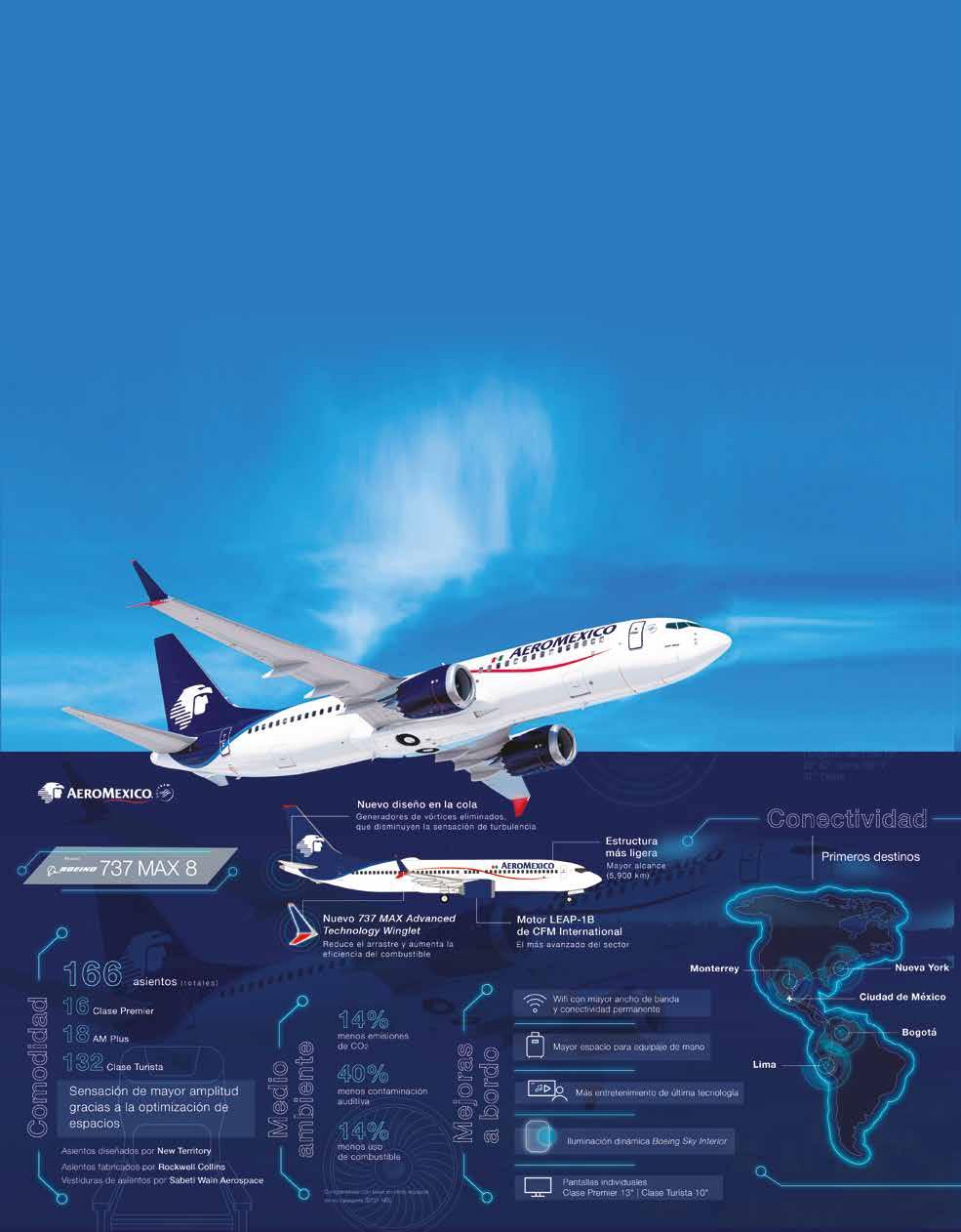 Aeroméxico utilizará el Boeing 737 MAX 8 para vuelos entre la Ciudad de México, Monterrey, Nueva York; Lima, Perú, y Bogotá, Colombia.