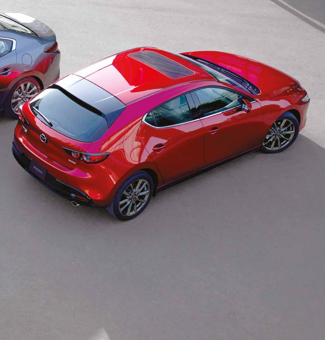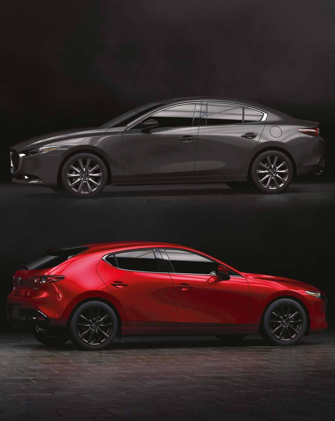 La versión hatchback representa "el espíritu libre, determinado a seguir sus propias convicciones y no a verse obligado por la sabiduría convencional", dice Mazda. Eliminó todas las líneas de caracteres y se basa totalmente en paneles de cuerpo curvo que reflejan el entorno que lo rodea. Cuando se ven desde la parte trasera, la cabina y el cuerpo se unen para aparecer como una sola masa sólida. Juego de luces y sombras. Con la versión sedán, cuyo personaje "combina la dignidad con una fuerte racha individualista", Mazda 3 superó numerosos desafíos técnicos para mantener el toldo y maletero bajos. Las proporciones resultantes son muy elegantes.