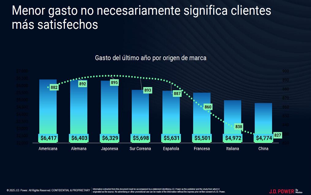 Los propietarios de vehículos de marcas chinas gastan menos en servicio, experimentan menor satisfacción y son menos leales: Estos propietarios reportan el menor gasto en servicio entre todas las marcas. Sin embargo, este menor costo no se correlaciona con una mayor satisfacción: la satisfacción general entre estos propietarios es de 827, 58 puntos por debajo de la media del sector (885).