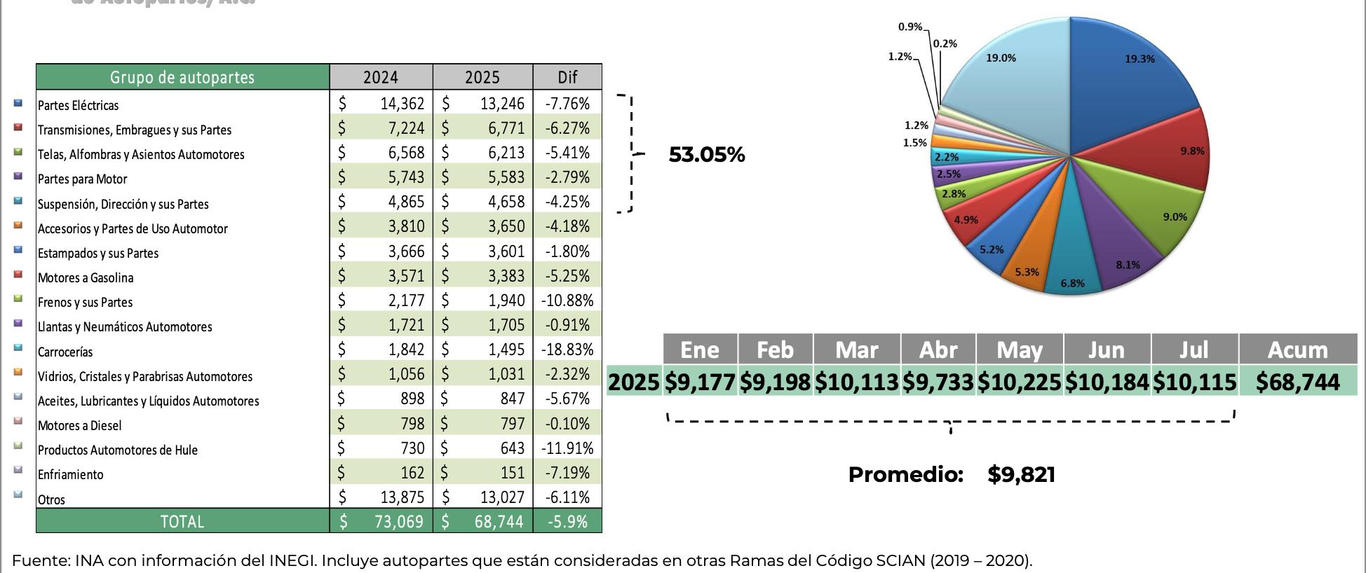 Durante su reporte de octubre, la Industria Nacional de Autopartes (INA) informó que la producción del sector alcanzó 68,744 millones de dólares entre enero y julio de 2025, lo que representa una caída de 5.9% respecto al mismo periodo del año anterior. Los mayores descensos se observaron en carrocerías (-18.8%), productos de hule (-11.9%) y frenos (-10.8%), afectados por la desaceleración en Estados Unidos y las tensiones arancelarias.
