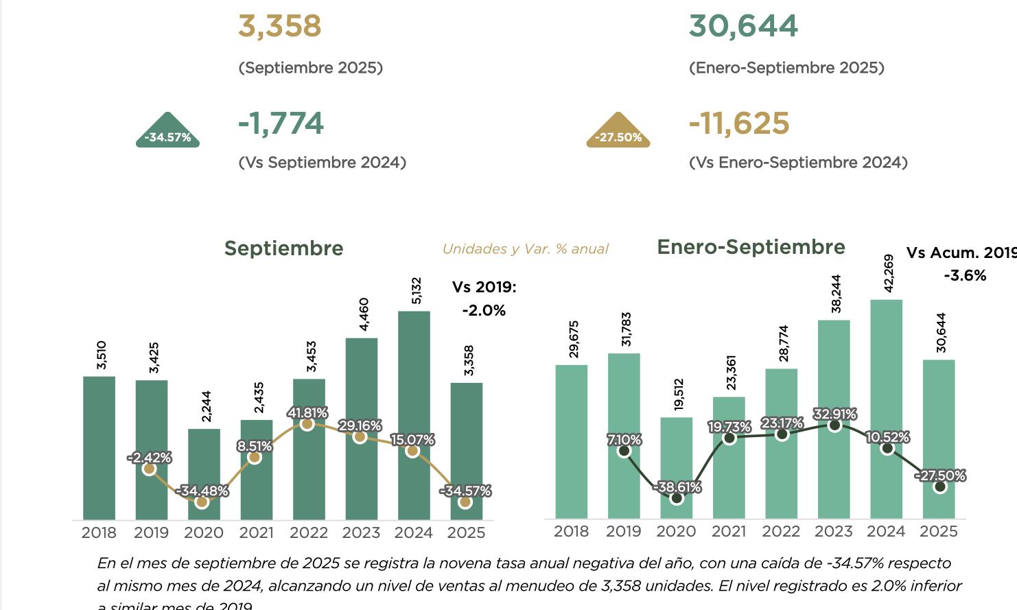 La industria mexicana de vehículos pesados atraviesa un periodo de profunda contracción. De enero a septiembre de 2025, las ventas al mayoreo registraron una caída de 51.8%, mientras que la producción se redujo 34.5% y las exportaciones descendieron 29.1%, según cifras de la Asociación Nacional de Productores de Autobuses, Camiones y Tractocamiones (ANPACT). Rogelio Arzate, presidente del organismo, explicó que la baja afecta tanto al segmento de carga como al de pasajeros, con contracciones de 52% y 50.4%, respectivamente, lo que marca el desempeño más débil desde la pandemia. En conferencia conjunta, Guillermo Rosales, presidente de la Asociación Mexicana de Distribuidores de Automotores (AMDA), coincidió en que la demanda interna se mantiene deprimida, con nueve meses consecutivos de caídas y sin señales de recuperación para el cierre del año. “El mercado está atrapado en una combinación de incertidumbre económica y política comercial que inhibe las decisiones de compra e inversión”, afirmó. El panorama se complica por el anuncio de un nuevo arancel estadounidense a los vehículos pesados, impulsado por el expresidente Donald Trump, que podría entrar en vigor el 1 de noviembre. Arzate reconoció que aún no hay