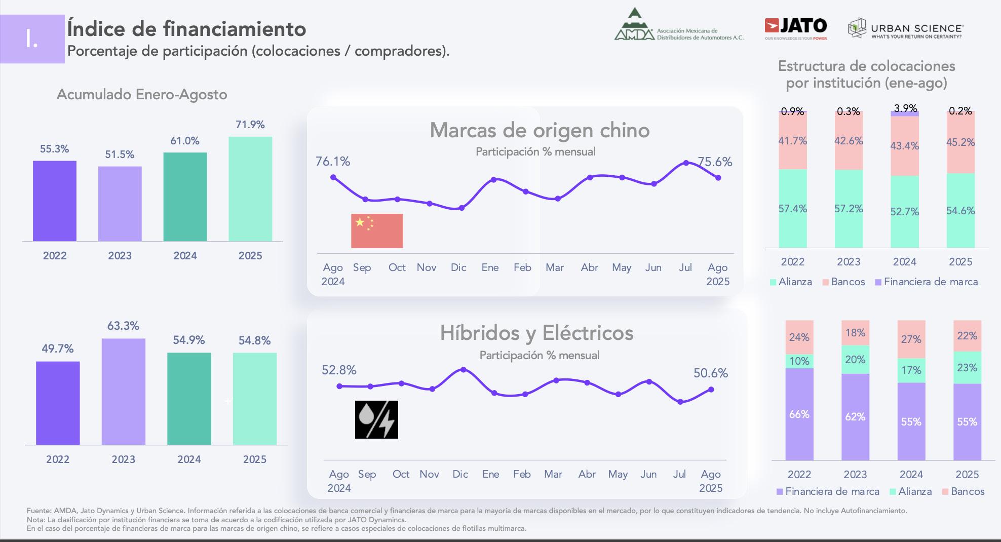 El crédito automotriz sigue siendo el pilar del mercado mexicano. De acuerdo con el Reporte de Financiamiento y Compradores de Vehículos Ligeros Ene-Agosto 2025, elaborado por AMDA, JATO Dynamics y Urban Science, el 60.9% de las compras totales de autos nuevos se realizaron mediante algún esquema de financiamiento. En el mercado al menudeo, la cifra sube al 73%, reflejando la fuerte dependencia de los consumidores mexicanos del crédito para la adquisición de vehículos.