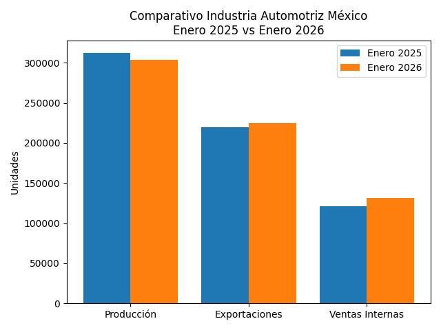 Durante enero de 2026, la producción alcanzó 303,980 unidades, lo que representó una disminución de 2.7% respecto al mismo mes de 2025 En contraste, las exportaciones registraron un crecimiento de 2.3%, con 224,528 vehículos enviados al extranjero, consolidando a México