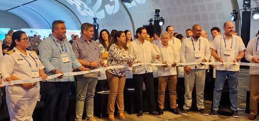 Directivos de organizaciones de transporte y de la industria, así como autoridades de Quintana Roo, cortan el listo inaugural de los trabajos del 23 Foro Nacional de Transporte de Mercancía, que organiza la Asociación Nacional de Transporte privado.