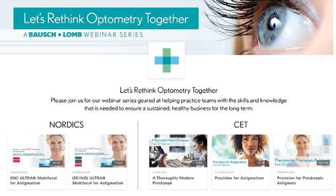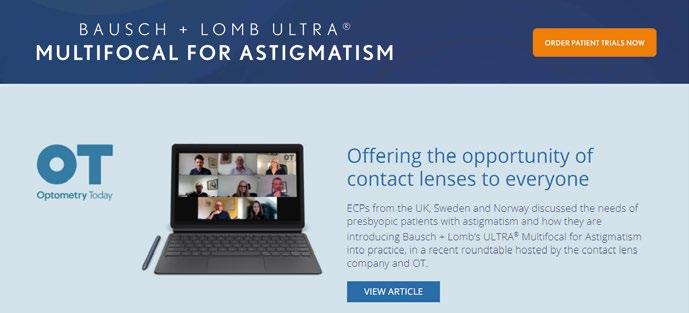 Training and education We continue to provide training and educational support to keep up with clinical insights through our on-demand CET and non-CET webinars on our Let’s Rethink Optometry Together educational platform: www.gotostage.com/channel/bausch KOL insights sharing By engaging with our KOL’s in a round table discussion we have been able to share some valuable insights and feedback on the performance of Bausch + Lomb ULTRA® Multifocal for Astigmatism and how best to introduce this lens into practices. View the article and video extracts here: www.bausch.co.uk/ultra-mfa
