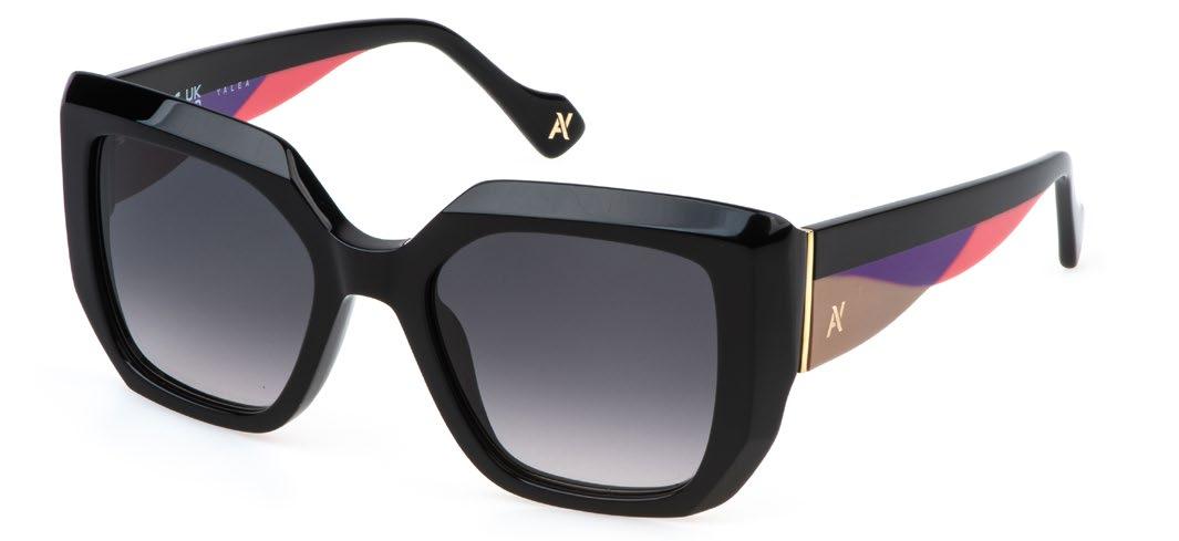 SYA152V col.752 are acetate sunglasses with a light square shape and a front piece embellished with elegant facets. Available in two black and havana with a tri-coloured bonding on the thick temples, other variants include fuchsia and aquamarine.