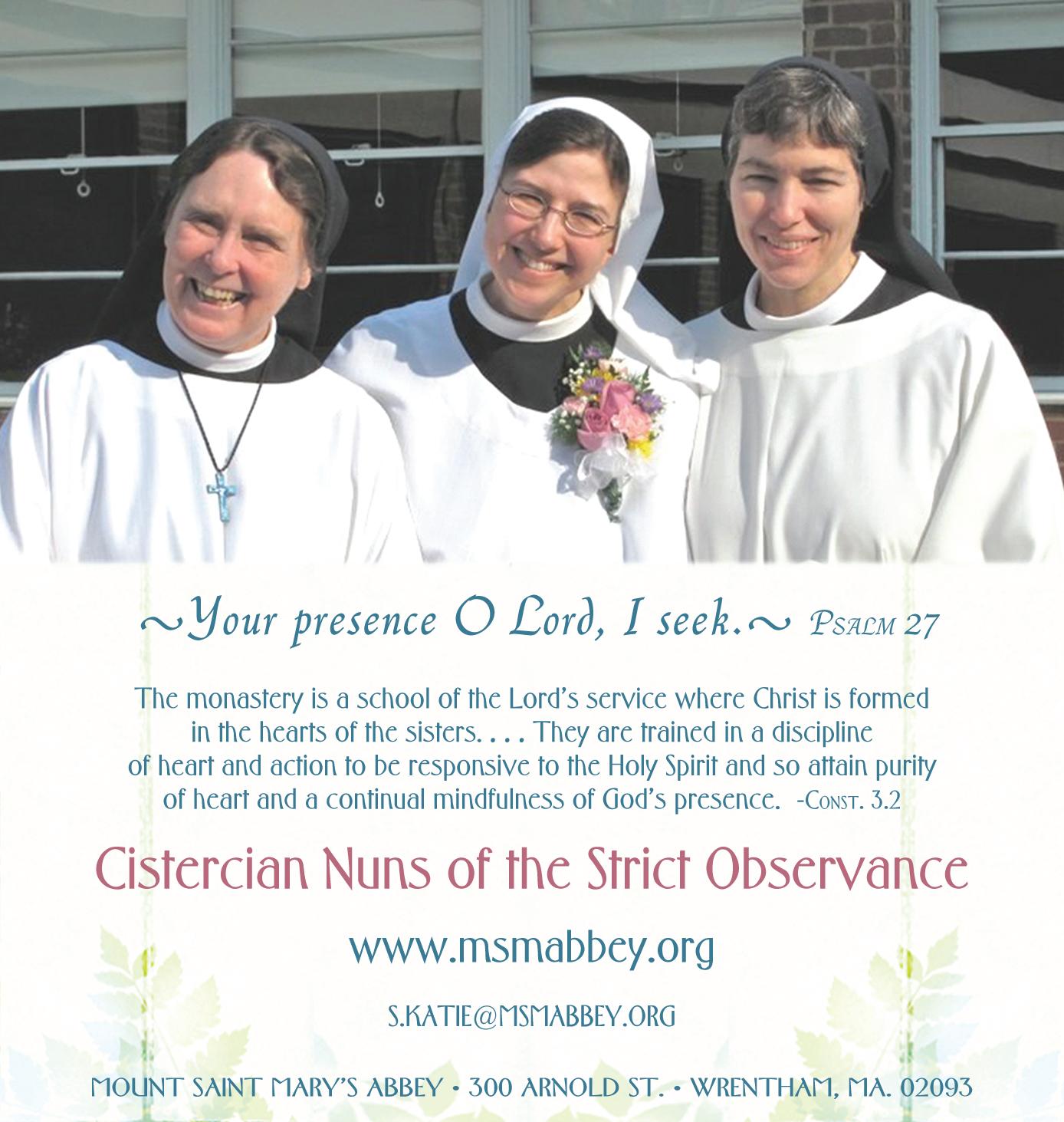Sister Katie McNamara, O.C.S.O., a Cistercian nun, is infirmarian and vocation director of Mount Saint Mary’s Abbey in Wrentham, Massachusetts. of time only, the monastic life offers a peace that is not an escape but a return to reality, to that real world for which the human heart was first created. In the cacophony of today’s society the heart is often deafened to the voice of God. In monastic life we are led out into the desert where there is no place to hide and therefore where we can find our true selves in God. The horizons stretch as far as the eye can see, allowing hearts to expand on the journey toward the God who has called us to follow. The wideopen spaces overflow with the freedom found only when one is brought home to the heart of Jesus.