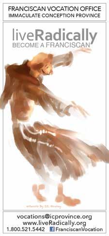 Immaculate Conception Province Mission Statement: “Following Christ in the footsteps of Saint Francis, we are a fraternity of men who freely vow ourselves to living in communion as brothers. We strive to live the Gospel through gentleness, hospitality, and service. We seek to address the changing needs of the Church and the world by calling ourselves and others to prayer and conversion.” Our friars use their gifts to respond to the needs of the Church and world serving as parish priests, retreat directors, educators, chaplains, campus ministers, artists, advocates for ecological and social justice and pastoral ministers. The strength of our formation program is its flexible response to each person’s unique personality and gifts. Our friars serve in Pennsylvania, Washington, D.C., West Virginia, Virginia, Florida, Texas, Ohio and Minnesota. If you are 40 or younger and would like more information contact: Fr. David Kaczmarek, T.O.R., 501 Walnut St., Hollidaysburg, PA 166481529; 1-800-220-0867; e-mail: davidktor@yahoo. com; website: www.franciscanfriarstor.com. See our web ad at www.VocationNetwork.org.