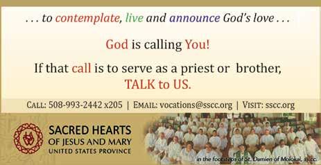 Priests of the Sacred Heart (S.C.J.) We are an apostolic congregation of Priests, Brothers, and Deacons inspired by the mystery of God’s love expressed in the heart of Christ. Fr. Leo John Dehon, our founder, was convinced that the best way to respond to our experience of God’s love is by reaching out to those around us and helping them to experience that same love in their own lives. This often means addressing unjust situations and circumstances that prevent people from reaching their full potential. Much of our work in the U.S. is with the poor and working class. Foreign missions are available. We prefer candidates 18-40 (will consider to age 45) with religious and/or social involvement, a solid academic background, and appropriate work history. Vocation Director, P.O. Box 206, Hales Corners, WI 53130-0206; toll free (800) 609-5559; fax: (414) 529-3377; e-mail: vocationcentral@wi.twcbc. com; website: www.scjvocation.org.